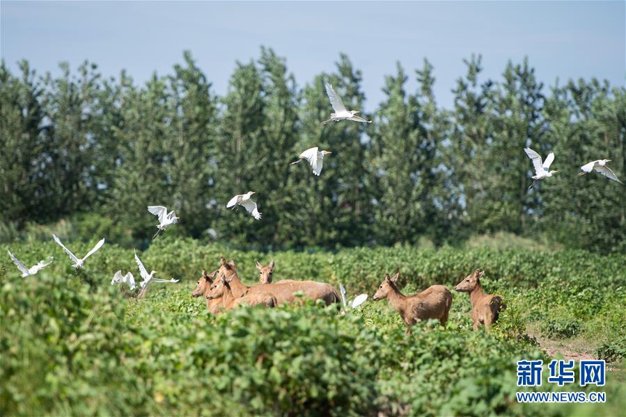 这是8月7日在东洞庭湖麋鹿和鸟类救治避难中心拍摄的麋鹿和飞鸟。位于湖南省岳阳市的东洞庭湖麋鹿和鸟类救治避难中心成立于2016年9月,占地400余亩,中心自建成后就承担起东洞庭湖区域全部麋鹿的救援、医治、康复和喂养任务。目前该中心共有14只麋鹿正在接受救助。新华社记者陈思汗摄