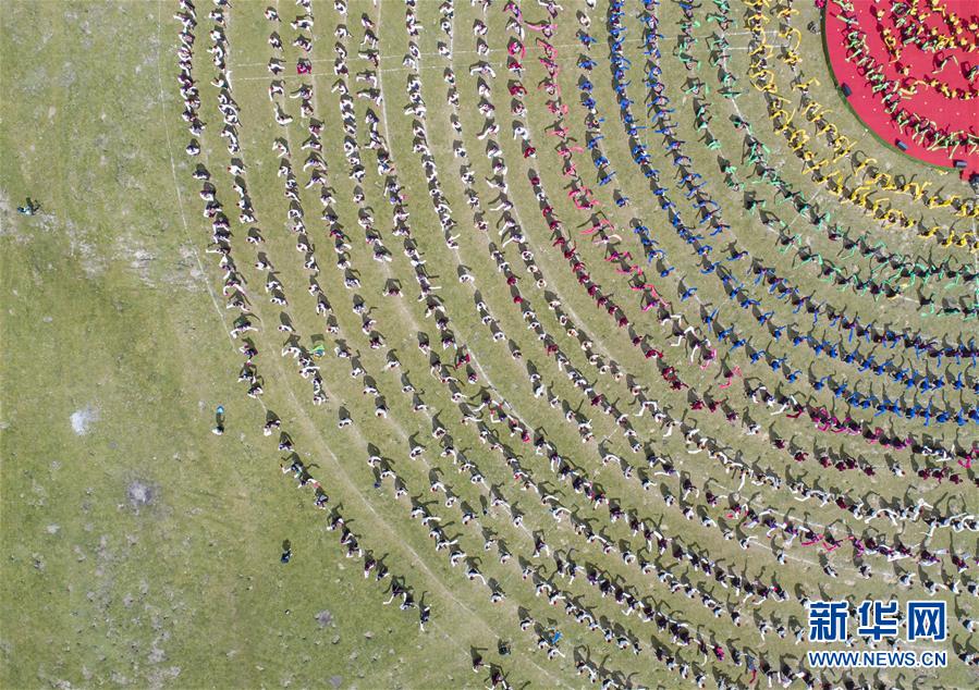 西藏首届弦子舞展演现场(8月7日摄,无人机照片)。当日,西藏首届弦子舞展演在昌都市芒康县举行。众多演员同台献艺,表演国家级非物质文化遗产弦子舞,吸引西藏各地的群众前来观看。新华社记者孙非摄