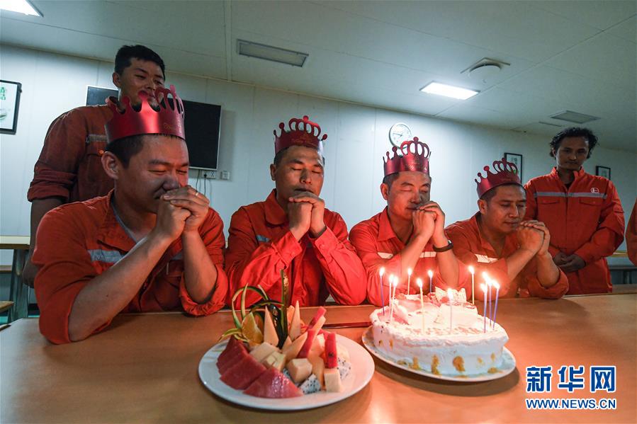 7月22日,在位于南海北部海域的勘探三号钻井平台上,4名钻井工人在平台餐厅里过集体生日。新华社记者蒲晓旭摄