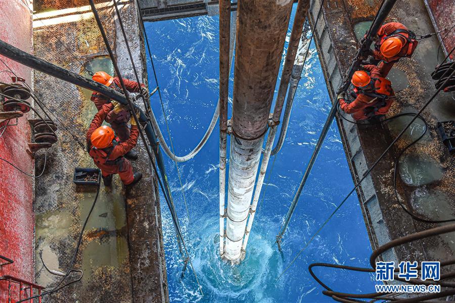 7月27日,工人在位于南海北部海域的勘探三号钻井平台上作业。新华社记者蒲晓旭摄
