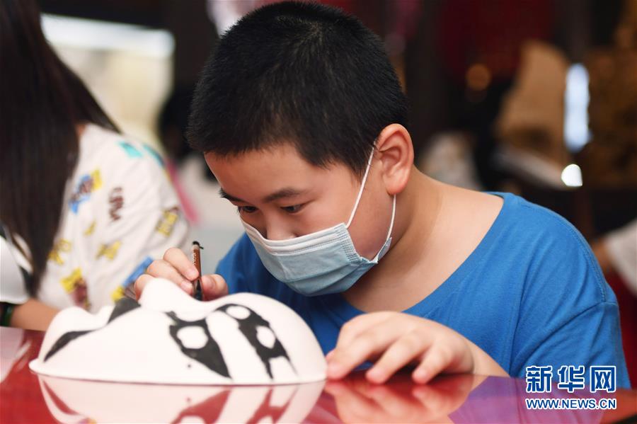 8月8日,小朋友在长沙市非物质文化遗产展示馆体验湘剧脸谱绘制。暑假期间,许多小朋友来到位于湖南省长沙市橘子洲景区的长沙市非物质文化遗产展示馆参观体验。新华社记者 薛宇舸 摄