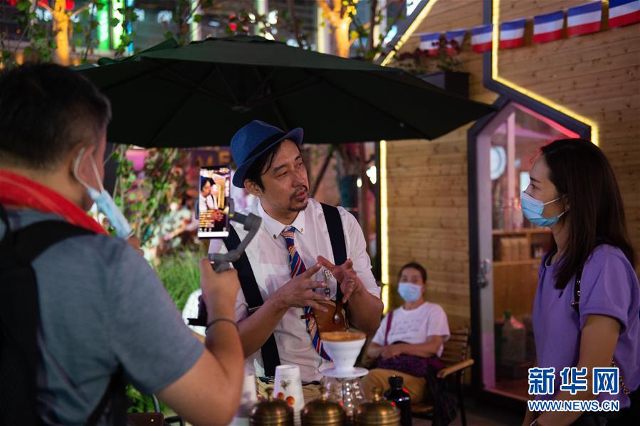8月8日晚,望京小街商业街上一家咖啡店的工作人员(中)在接受网络直播采访。新华社记者 陈钟昊 摄