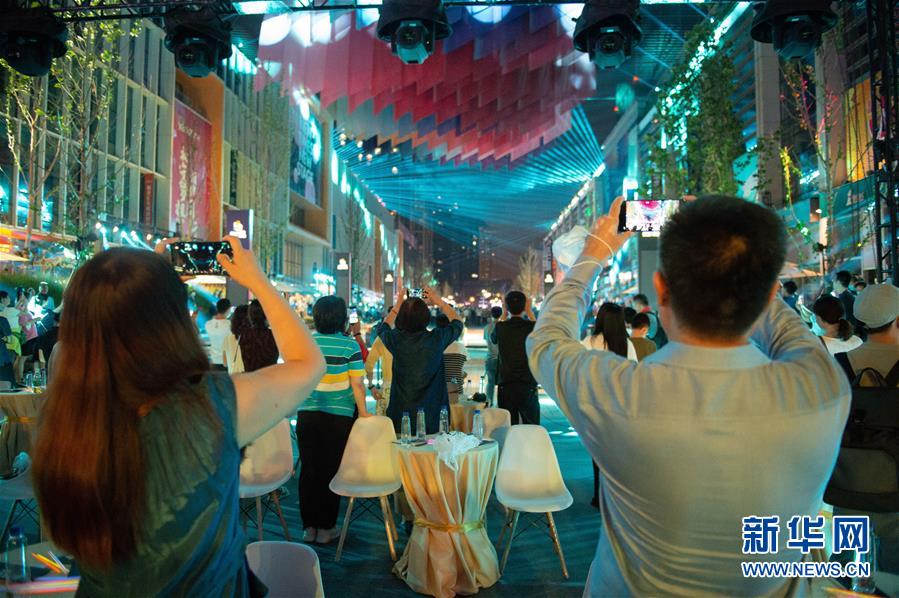 8月8日晚,市民在望京小街商业街观看灯光秀。新华社记者 陈钟昊 摄