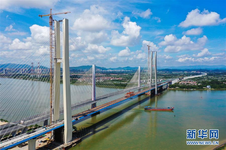 8月9日拍摄的广州南沙港铁路跨西江特大斜拉桥最后一块钢箱梁吊装施工现场(无人机照片)。当日,中铁十一局承建的粤港澳大湾区基础设施“硬联通”重点工程——广州南沙港铁路跨西江特大斜拉桥完成最后一块钢箱梁吊装作业,大桥即将合龙。该桥位于广东佛山市和江门市交界处,全长1117.5米。新华社记者刘大伟摄。