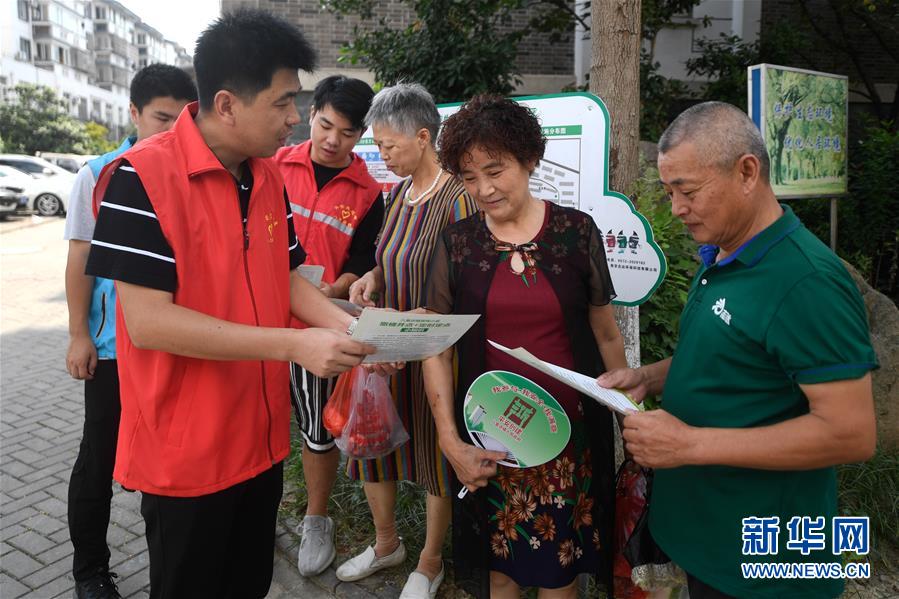 8月9日,湖州市吴兴区八里店镇志愿者(左)在百合苑小区向居民介绍生活垃圾定点投放的注意事项。近年来,浙江省通过创新宣传教育,多措并举促进垃圾分类投放、收运及处置的良性循环,引领垃圾分类成为城乡居民的生活新风尚。新华社记者黄宗治摄。