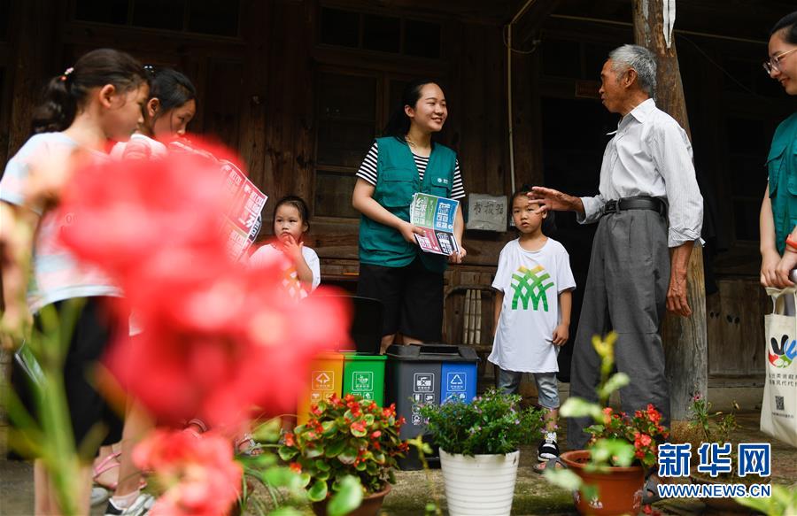 宁波市奉化区的小草志愿服务队志愿者(中)在大堰镇箭岭村向村民和小学生讲解垃圾分类的方法(2019年6月30日摄)。近年来,浙江省通过创新宣传教育,多措并举促进垃圾分类投放、收运及处置的良性循环,引领垃圾分类成为城乡居民的生活新风尚。新华社记者黄宗治摄。