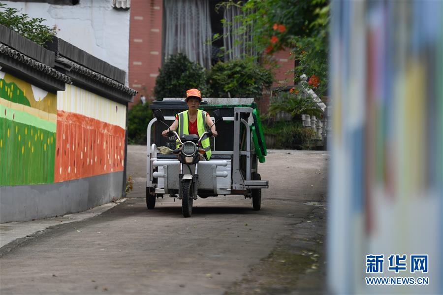 湖州市吴兴区妙西镇龙山村清运人员在村里收集生活垃圾(8月5日摄)。近年来,浙江省通过创新宣传教育,多措并举促进垃圾分类投放、收运及处置的良性循环,引领垃圾分类成为城乡居民的生活新风尚。新华社记者黄宗治摄。