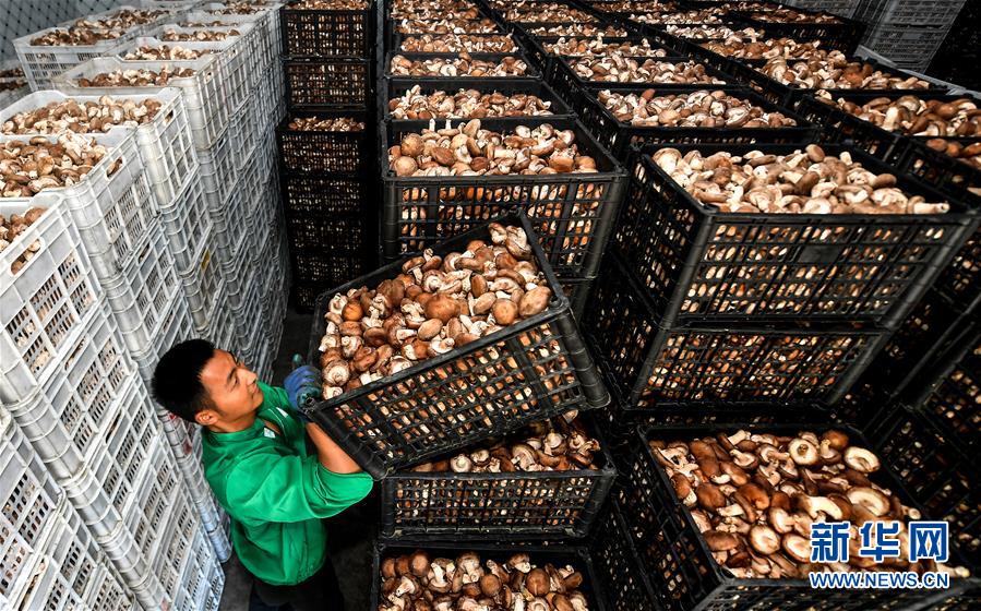 陕西汉中市留坝县武官驿镇留香益品商贸公司的员工在摆放冷库里的香菇(7月2日摄)。陕西留坝县是陕西西南部的特色农业产业县,近年来在推进产业富民的过程中,开辟出一条“政府+龙头企业+扶贫社+农户”的订单产业发展道路,把农户绑在产业链上,持续带动农业增效、农民增收。新华社记者刘潇摄。