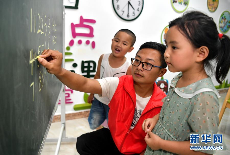 陕西安康市岚皋县城关镇城北易地扶贫搬迁安置小区“四点半课堂”的老师在辅导孩子们学习数字(7月29日摄)。地处秦巴山区的岚皋县山多沟深,群众居住分散,长期以来易地搬迁成为这里脱贫攻坚的重点。为避免易地搬迁群众就业不充分、办事不方便、管理不到位等问题,岚皋县依托市场完善社区生活、医疗、教育、娱乐等服务设施,并开展技能培训、开办社区工厂,让搬迁居民“稳得住”“能致富”。新华社记者刘潇摄。