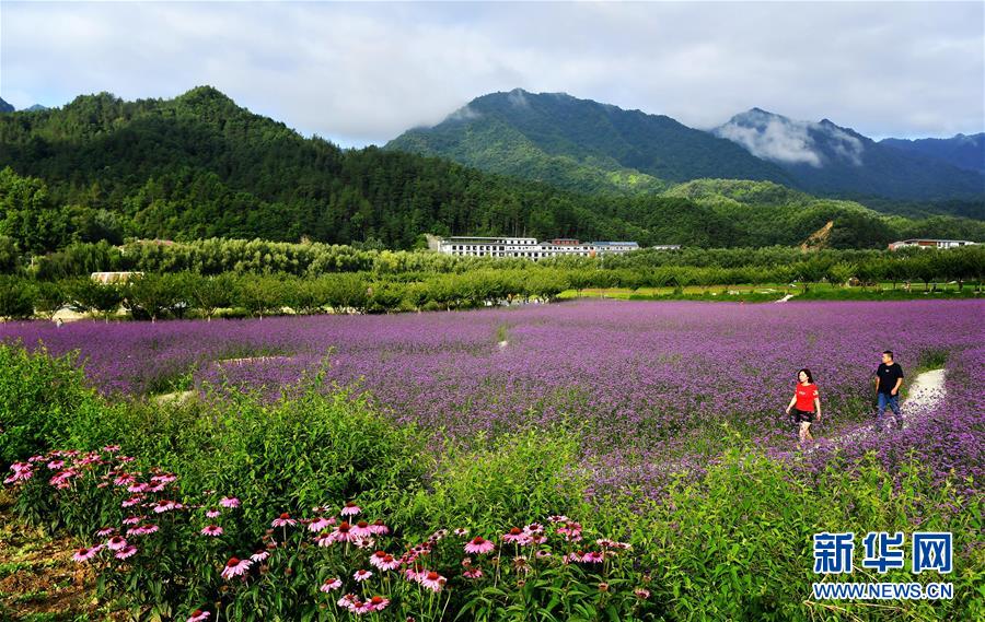 市民在位于陕西汉中市留坝县城的金水湾花海散步(7月2日摄)。近年来,陕西地处秦巴山区的多个县市结合当地自然气候条件打造特色花海景观,利用“花海经济”助力脱贫攻坚和乡村振兴。新华社记者刘潇摄。