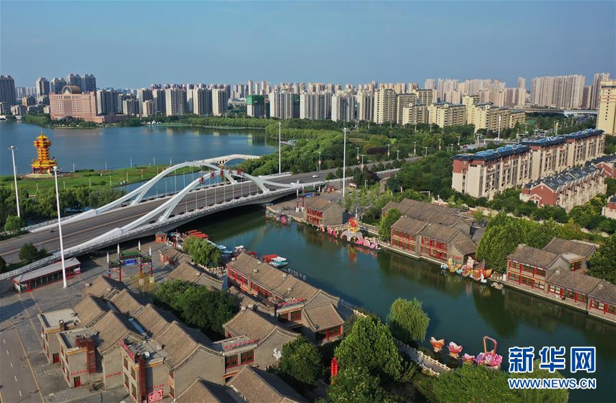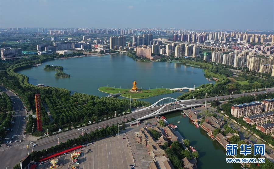 8月9日拍摄的唐山市丰南区惠丰湖景色(无人机照片)。近年来,河北省唐山市丰南区全力推动“全域治水、清水润城”工程,形成了以唐津运河、人民公园生态廊道等以健身、休闲、旅游功能于一体的人水相亲、城水相依的景观环境,为绿色发展注入活力。新华社记者杨世尧摄。