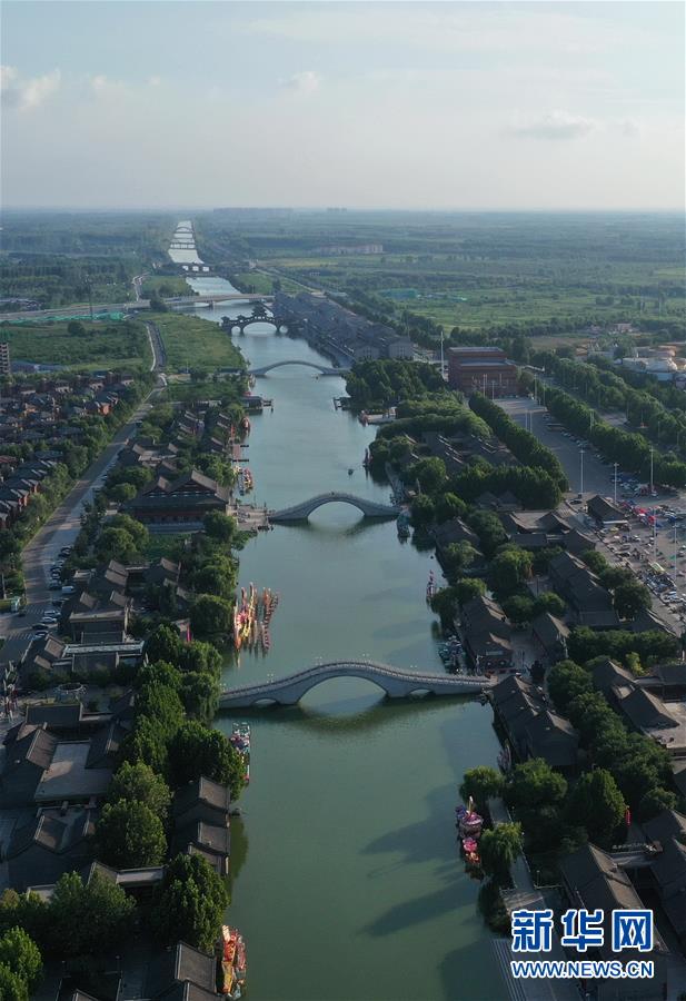 8月9日拍摄的唐山市丰南区唐津运河景色(无人机照片)。近年来,河北省唐山市丰南区全力推动“全域治水、清水润城”工程,形成了以唐津运河、人民公园生态廊道等以健身、休闲、旅游功能于一体的人水相亲、城水相依的景观环境,为绿色发展注入活力。新华社记者杨世尧摄。