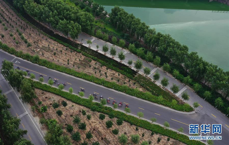 自行车爱好者在唐山市丰南区唐津运河景观大道骑行(7月31日摄,无人机照片)。近年来,河北省唐山市丰南区全力推动“全域治水、清水润城”工程,形成了以唐津运河、人民公园生态廊道等以健身、休闲、旅游功能于一体的人水相亲、城水相依的景观环境,为绿色发展注入活力。新华社记者杨世尧摄。