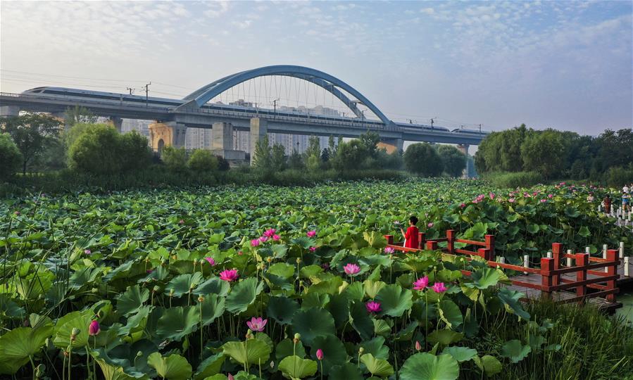 市民在唐山市丰南区人民公园欣赏荷花(7月25日摄,无人机照片)。近年来,河北省唐山市丰南区全力推动“全域治水、清水润城”工程,形成了以唐津运河、人民公园生态廊道等以健身、休闲、旅游功能于一体的人水相亲、城水相依的景观环境,为绿色发展注入活力。新华社记者杨世尧摄。