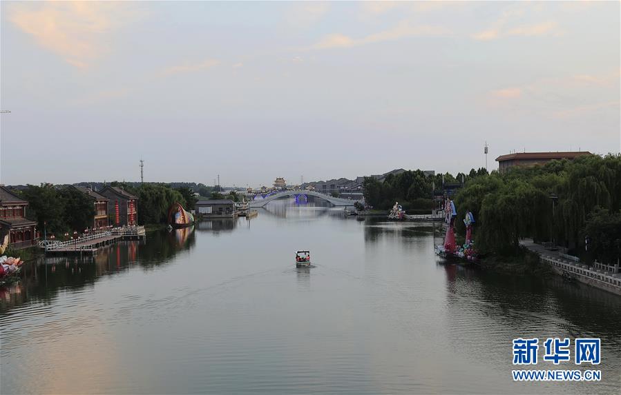 8月9日拍摄的唐山市丰南区唐津运河夜景(无人机照片)。近年来,河北省唐山市丰南区全力推动“全域治水、清水润城”工程,形成了以唐津运河、人民公园生态廊道等以健身、休闲、旅游功能于一体的人水相亲、城水相依的景观环境,为绿色发展注入活力。新华社记者杨世尧摄。