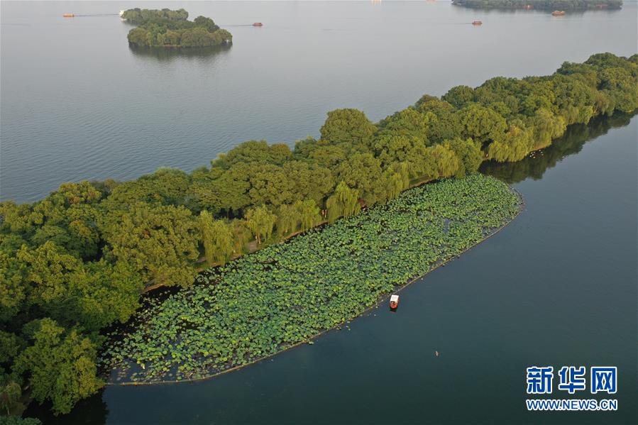 游客在西湖景区苏堤附近观赏荷花(6月30日摄,无人机照片)。新华社记者黄宗治摄。