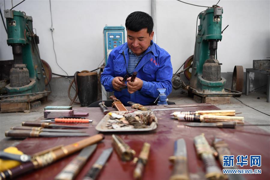 8月10日,在甘肃省临夏回族自治州积石山县大河家镇,国家级非物质文化遗产代表性项目保安族腰刀锻制技艺传承人马尕主麻在查看锻制好的保安腰刀。新华社记者陈斌摄。