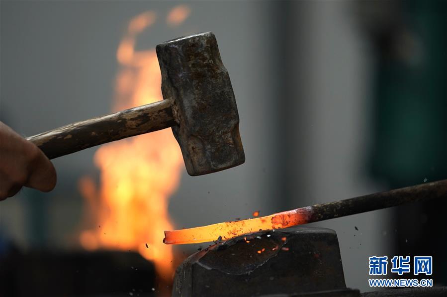 8月10日,甘肃省临夏回族自治州积石山县大河家镇的村民在制作保安腰刀。新华社记者邢广利摄。