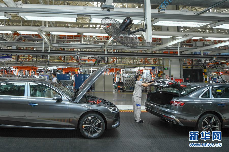 8月10日,在一汽-大众长春基地总装车间,工人检查装配好的车辆。中国第一汽车集团有限公司7月销售整车32.2万辆,同比增长23.2%,延续上半年的增长态势。新华社记者张楠摄。
