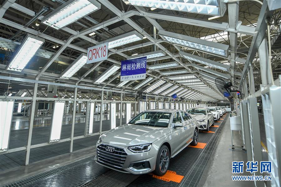 8月10日,在一汽-大众长春基地总装车间,装配好的车辆接受淋雨测试。中国第一汽车集团有限公司7月销售整车32.2万辆,同比增长23.2%,延续上半年的增长态势。新华社记者张楠摄。