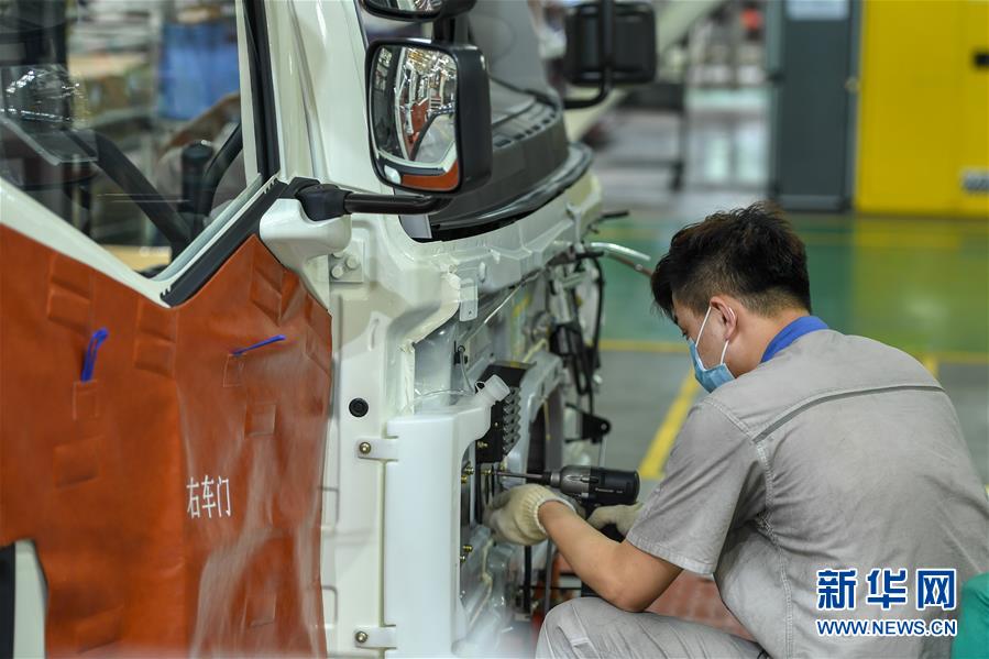 8月10日,在位于长春市的一汽解放总装车间,工人在装配车辆。中国第一汽车集团有限公司7月销售整车32.2万辆,同比增长23.2%,延续上半年的增长态势。新华社记者张楠摄。