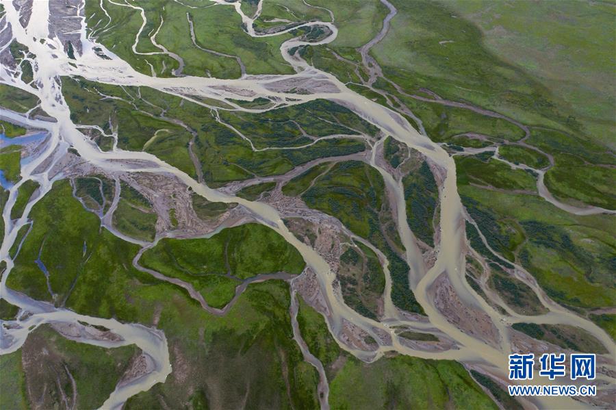 俯瞰泥拉坝湿地里发辫般的河流,该湿地泥炭富集、水系发达(8月9日摄,无人机照片)。新华社记者江宏景摄。