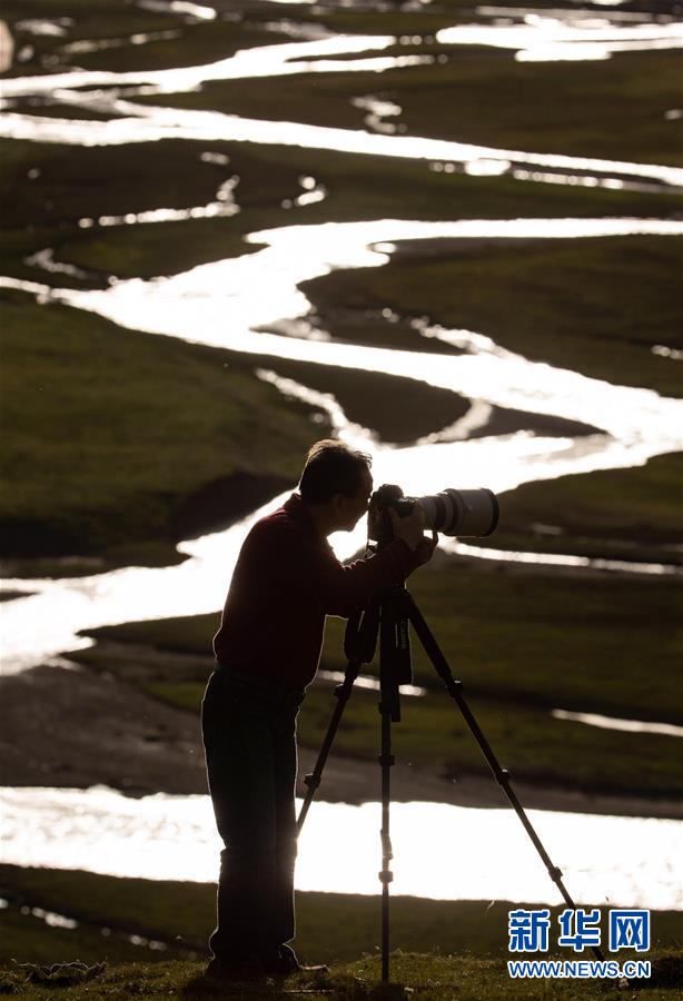 一名来自成都的摄影师在拍摄泥拉坝湿地(8月9日摄)。新华社记者江宏景摄。