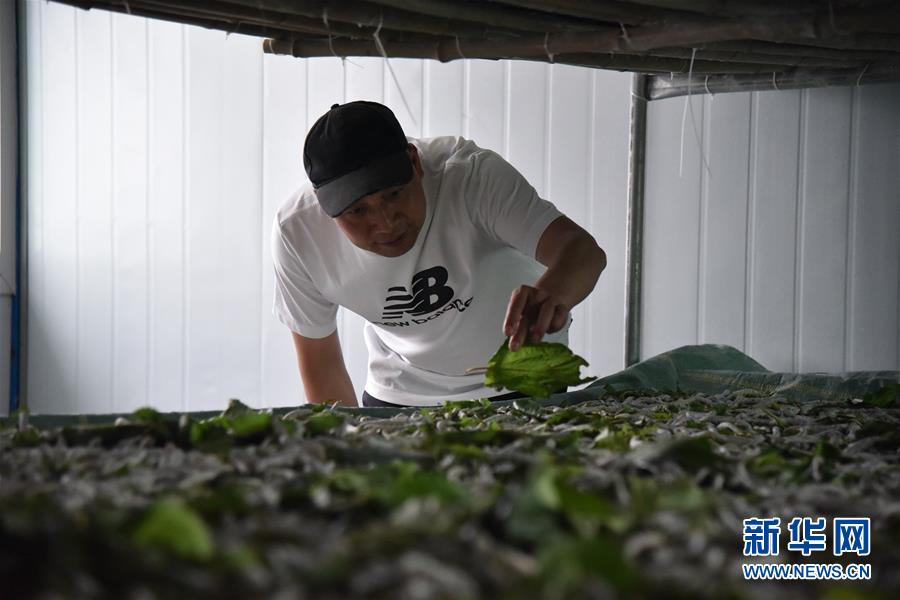 在贵州省毕节市纳雍县勺窝镇,纳雍县瑞慧桑蚕养殖发展有限责任公司负责人在查看桑蚕饲养情况(7月21日摄)。新华社记者骆飞摄。
