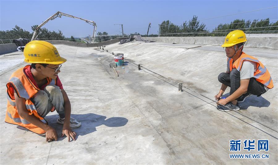8月10日,工人在京雄城际铁路霸州北站建设工地进行屋面坡层校核。京雄城际铁路霸州北站站台雨棚混凝土结构施工日前全部完成,目前霸州北站已全面转入装饰装修和机电安装阶段,预计2020年底投入使用。京雄城际铁路是连接北京市区、大兴机场和雄安新区的重要干线。建成后,将进一步完善京津冀区域高速铁路网结构,便利沿线群众出行,对于推动京津冀协同发展和支撑建设雄安新区具有重要意义。新华社记者李晓果摄。