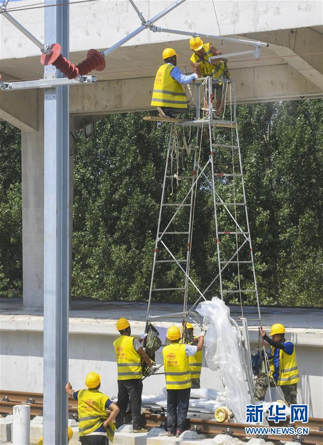 8月10日,工人在京雄城际铁路霸州北站建设工地为接触网卡定位。京雄城际铁路霸州北站站台雨棚混凝土结构施工日前全部完成,目前霸州北站已全面转入装饰装修和机电安装阶段,预计2020年底投入使用。京雄城际铁路是连接北京市区、大兴机场和雄安新区的重要干线。建成后,将进一步完善京津冀区域高速铁路网结构,便利沿线群众出行,对于推动京津冀协同发展和支撑建设雄安新区具有重要意义。新华社记者李晓果摄。