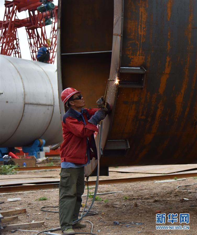 在黑龙江省讷河市华瑞生物医药项目焊接现场,工人在焊接发酵罐(8月4日摄)。新华社记者梁冬摄。