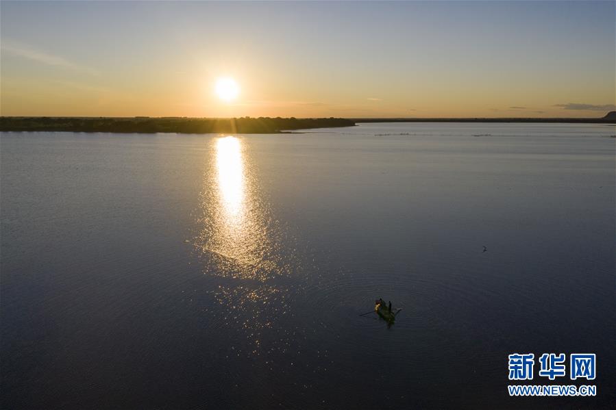 7月24日,渔民在大力加湖中捕鱼(无人机照片)。大力加湖面积28.5平方公里,两岸地势低平,多湿地、草原,湖内水产丰富。新华社记者谢剑飞摄。