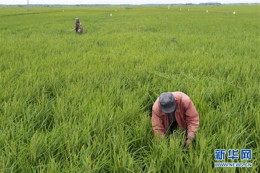 8月11日,农民在抚远市一处稻田中清除杂草。时下,“华夏东极”黑龙江省抚远市的水稻长势良好,苍翠的稻田一望无际,犹如绿毯铺在大地上。新华社记者谢剑飞摄。