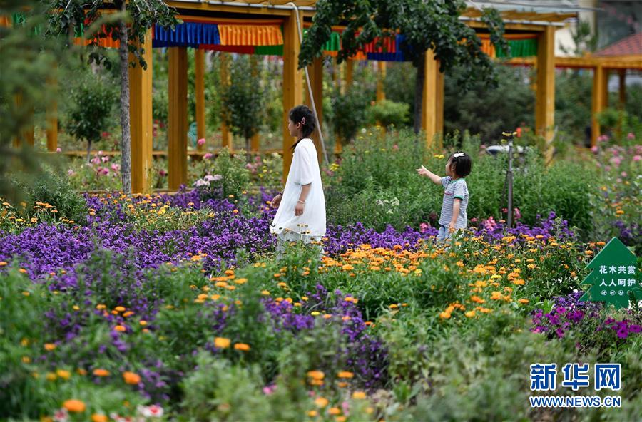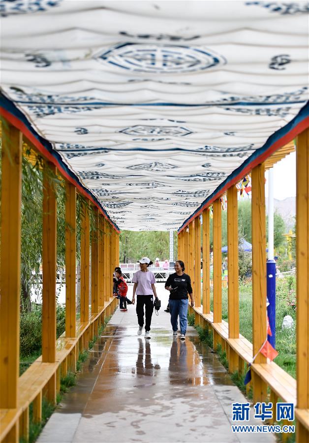 8月11日,游客在尖扎县昂拉乡德吉村景观长廊内游玩。新华社记者张龙摄
