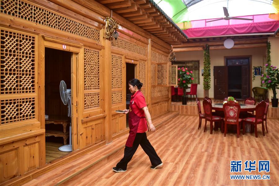 8月11日,尖扎县昂拉乡德吉村村民角巴措在自家民宿内为旅客送食品。新华社记者张龙摄