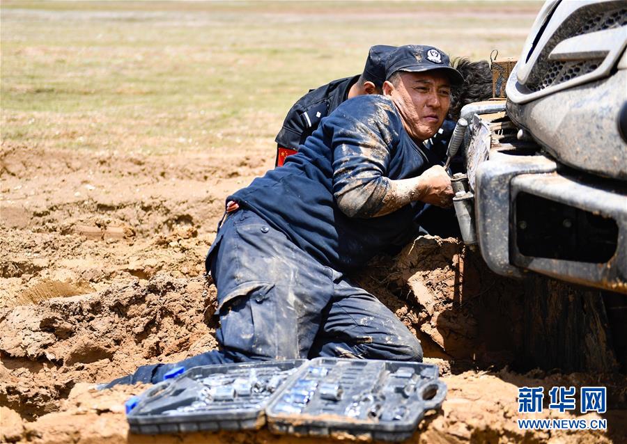 7月6日,卓乃湖保护站站长秋培扎西在可可西里地区修理车辆。新华社记者张龙摄
