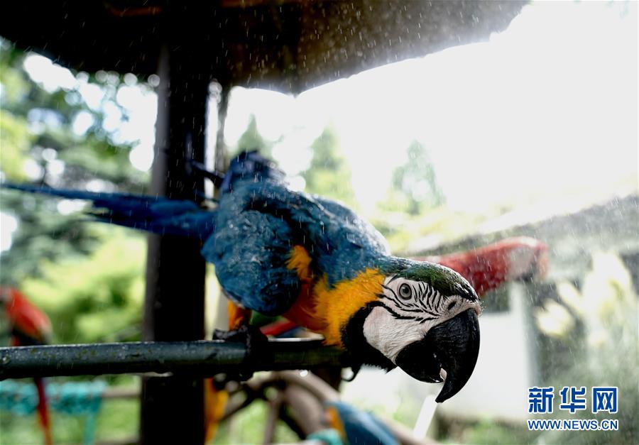 8月11日,上海动物园的金刚鹦鹉在享受喷淋降温。当日,上海最高温度达到35摄氏度,上海动物园开启园内安装的各种喷淋装置,让动物们防暑降温,乐享清凉。新华社记者张建松摄