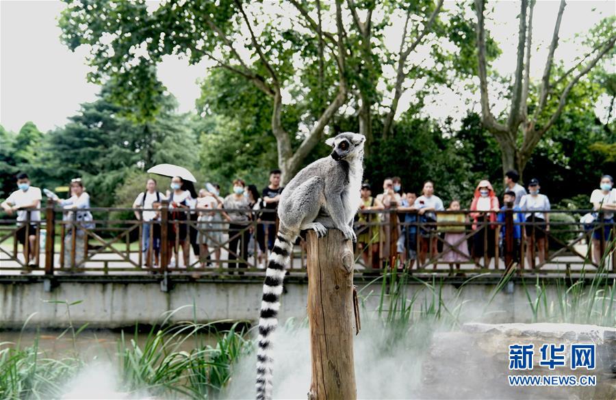 8月11日,上海动物园的环尾狐猴在“地喷”营造的水雾中玩耍。当日,上海最高温度达到35摄氏度,上海动物园开启园内安装的各种喷淋装置,让动物们防暑降温,乐享清凉。新华社记者张建松摄