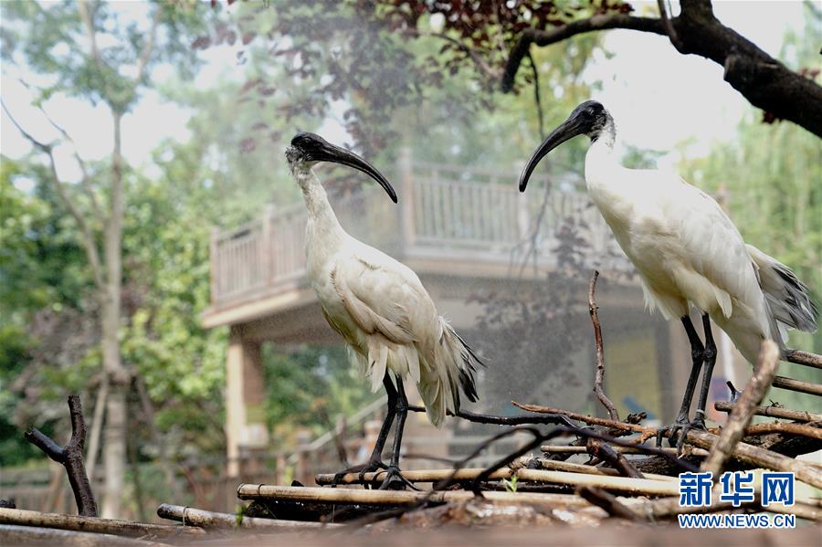 8月11日,上海动物园的两只白鹮在享受喷淋降温。当日,上海最高温度达到35摄氏度,上海动物园开启园内安装的各种喷淋装置,让动物们防暑降温,乐享清凉。新华社记者张建松摄