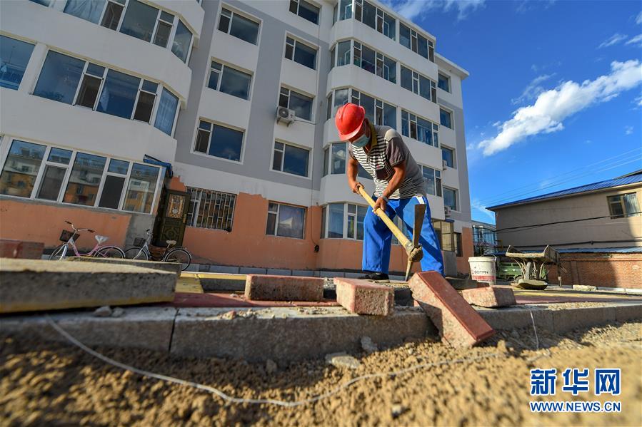 8月11日,工人在镇赉县庆生社区一老旧小区内铺设路面方砖。2019年底开始,吉林省白城市镇赉县对超过20年房龄的老旧小区进行全面改造升级,优先完成楼体内外墙面、楼顶防水、道路硬化工程,并协调各职能部门对地下管网、绿化美化等基础设施问题进行统筹施工,减少后期二次施工造成的环境破坏和资源浪费。一期工程预计于今年10月完工,施工完成后,政府相关部门将为这些小区统一配备物业公司,解决后期设施维护问题。新华社记者张楠摄