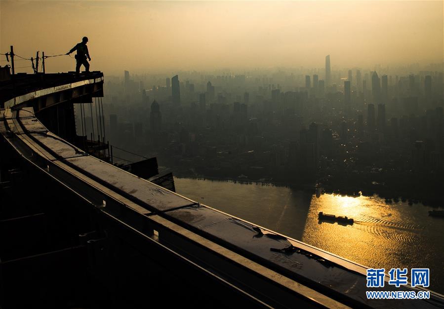 8月11日,工人在武汉绿地中心项目建设现场近500米的高空施工。
