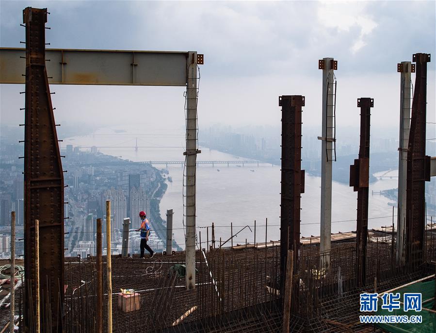 8月11日,工人在武汉绿地中心项目建设现场近500米的高空施工。新华社记者肖艺九摄