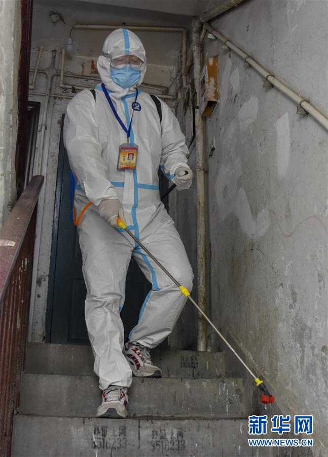 8月12日,乌鲁木齐市天山区山西巷社区工作人员王志鹰在对居民楼道进行消毒。新华社记者 高晗