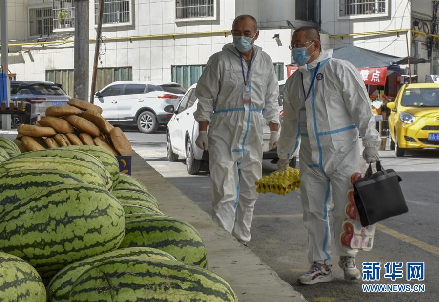 8月12日,乌鲁木齐市天山区山西巷社区工作人员王志鹰(右)在社区物资保障点前询问水果销售情况。新华社记者 高晗摄