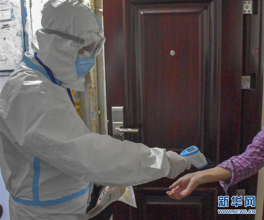 8月12日,乌鲁木齐市天山区山西巷社区工作人员王志鹰(左)上门为居家居民测量体温。新华社记者 高晗