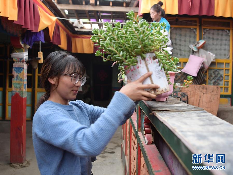 格桑旺姆用花草装饰自己家(8月3日摄)。新华社记者 李贺 摄