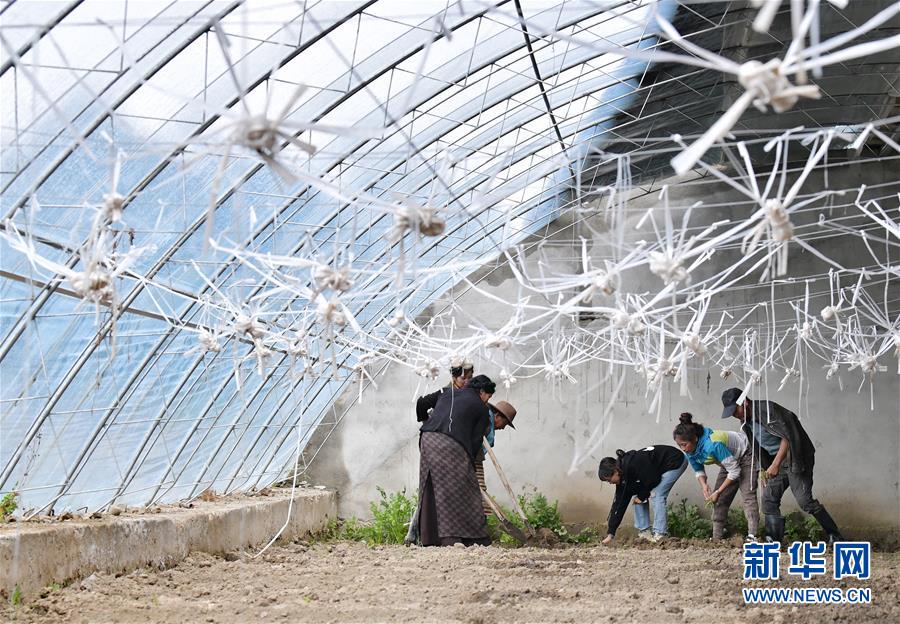 格桑旺姆(右三)与姐姐德吉卓玛(右二)带领工人在蔬菜大棚内翻地,准备种新的蔬菜(8月3日摄)。新华社记者 李贺 摄