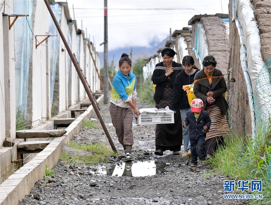 格桑旺姆(左三)和姐姐德吉卓玛(左一)带领雇佣的残障村民巴珍(右一)搬运大棚出产的新鲜蔬菜(8月3日摄)。新华社记者 李贺 摄