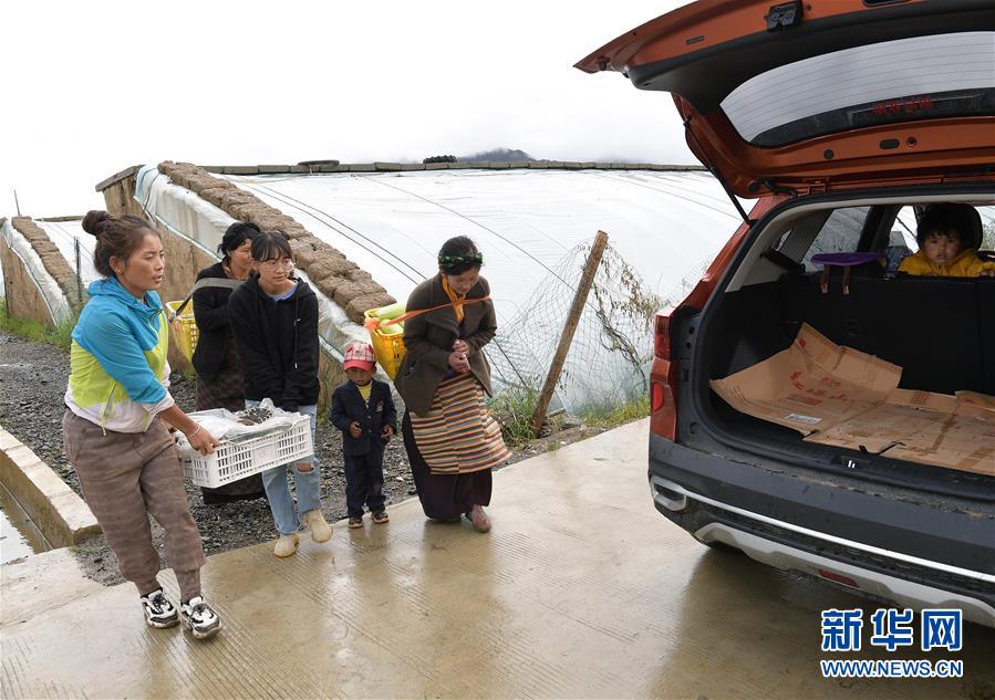 格桑旺姆(左三)和姐姐德吉卓玛(左一)带领工人将大棚出产的新鲜蔬菜抬上汽车,准备运往店铺销售(8月3日摄)。新华社记者 李贺 摄