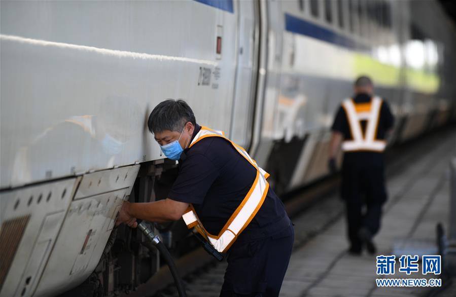 8月12日,长春火车站客运车间上水工王军在给列车上水。进入暑运高峰,为了保障列车正常用水,每当一列火车停靠车站,长春火车站的上水工就冒着酷暑将水管插进火车底部的输水口,快速准确完成输水作业。新华社记者 林宏 摄